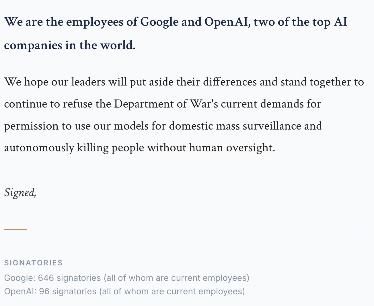 Sam Altman writes in a leaked memo that OpenAI shares Anthropic’s red lines, while confirming ongoing negotiations with the Department of War. Ninety six OpenAI employees and 646 Google employees sign an open letter.