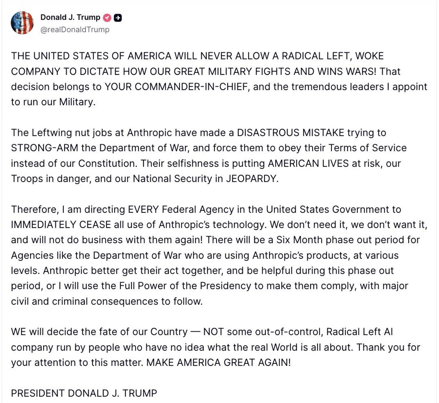 “In conjunction with the President's directive for the Federal Government to cease all use of Anthropic's technology, I am directing the Department of War to designate Anthropic a Supply-Chain Risk to National Security. Effective immediately, no contractor, supplier, or partner that does business with the United States military may conduct any commercial activity with Anthropic. Anthropic will continue to provide the Department of War its services for a period of no more than six months to allow for a seamless transition to a better and more patriotic service.